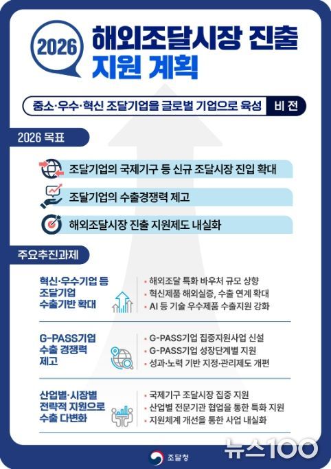 뉴스100 김동초 기자 | 조달청은 중소 혁신·기술우수 조달 기업들이 글로벌 기업으로 도약할 수 있도록 '2026년 해외조달시장 진출 지원계획'을 확정하여, 해외조달시장 진출을 위한 지원을 대폭 강화한다고 밝혔다.