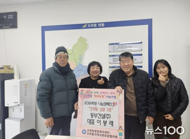 뉴스100 김동초 기자 | 동부건설(주)은 지역사회 이웃사랑 실천을 위해 지난 26일 오학동행정복지센터에 현금 100만 원을 기탁했다.