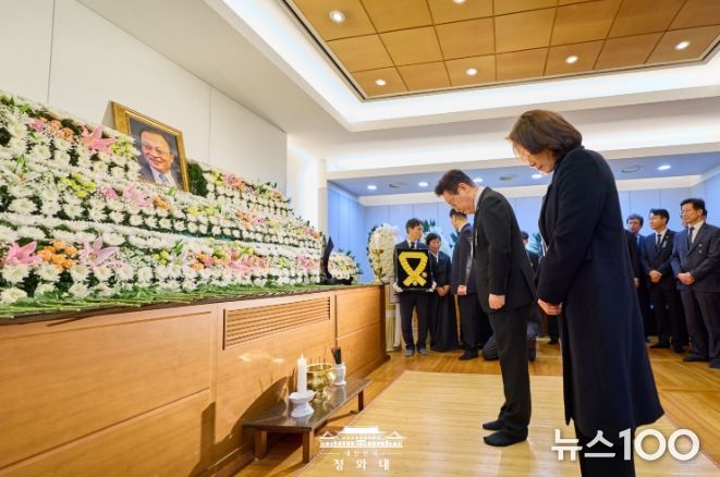 뉴스100 김동초 기자 | 이재명 대통령과 김혜경 여사가 1월 27일 서울 종로구 서울대병원 장례식장에 마련된 고 이해찬 전 총리 빈소를 찾아 영정을 향해 묵념하고 있다.