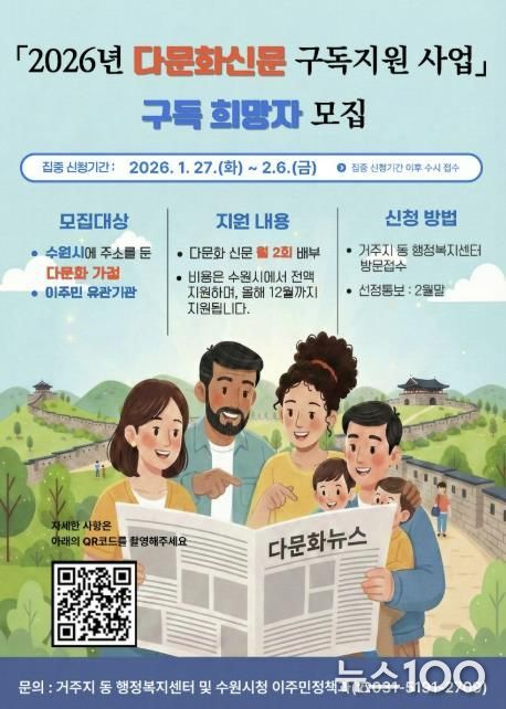 뉴스100 김동초 기자 | 수원특례시가 다문화가족의 한국 생활 적응을 돕기 위해 ‘다문화신문 구독 지원 사업’ 대상자를 모집한다.