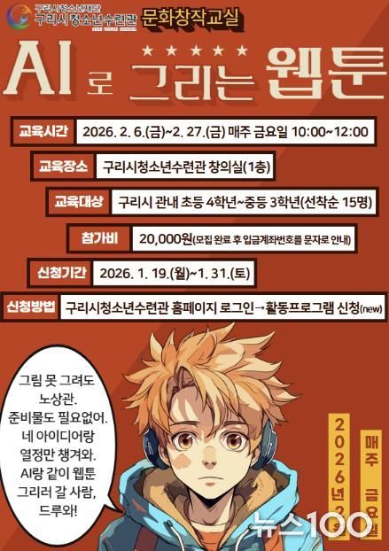 뉴스100 김동초 기자 | 구리시청소년재단 청소년수련관은 겨울방학을 맞아 2월 6일부터 27일까지 매주 금요일 문화 창작 교실 'AI로 그리는 웹툰' 프로그램을 운영한다. 이번 프로그램은 초등학교 4학년부터 중학생을 대상으로 매회 오전 10시부터 12시까지 총 4주간 진행된다.