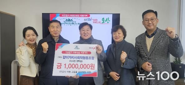 뉴스100 김동초 기자 | 오산시는 지난 30일, 같이가치사회적협동조합으로부터 관내 아동공동생활가정(그룹홈)인 ‘광야의집’ 입소 아동을 위한 후원성금 100만 원을 기탁받고 기탁식을 가졌다고 밝혔다.