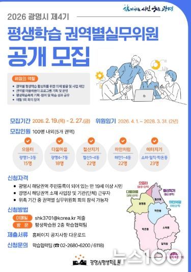 뉴스100 김동초 기자 | 광명시가 시민 주도의 생활권 중심 평생학습 정책을 강화하기 위해 ‘제4기 평생학습 권역별실무위원회’ 신규 위원 100명을 공개 모집한다.