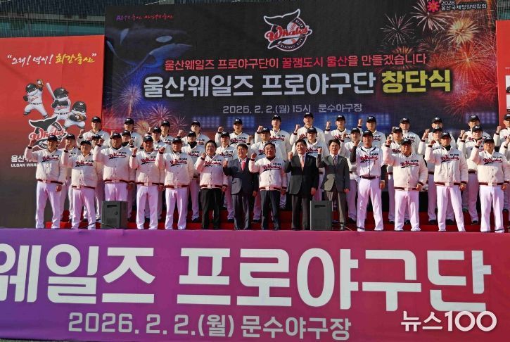 뉴스100 김동초 기자 | 울산광역시(시장 김두겸)는 2월 2일(월) 울산 문수야구장에서 '울산 웨일즈' 공식 창단식을 개최했다.
