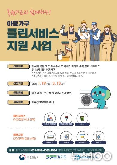 뉴스100 김동초 기자 | 경기도에서 열악한 주거환경에 거주하는 아동가구들을 위한 ‘아동가구 클린서비스 지원 사업’을 복권기금과 함께 추진한다.