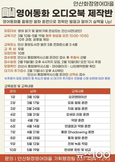뉴스100 김동초 기자 | 안산시가 설립하고 안산대학교가 운영하는 안산화정영어마을이 성인 영어 학습자를 위한 ‘영어동화 오디오북 제작반’을 3월부터 5월까지 10주 과정으로 안산시 중앙도서관에서 운영한다고 4일 밝혔다.