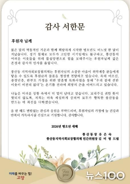 뉴스100 김동초 기자 | 고양특례시 일산동구 풍산동 지역사회보장협의체는 설명절을 앞둔 지난 3일 지난해 지역사회의 어려운 이웃을 위해 따뜻한 나눔을 실천한 후원자들에게 감사의 마음을 담은 서한문을 발송했다.