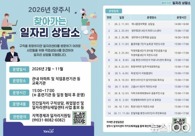뉴스100 김동초 기자 | 양주시가 구직 현장의 문턱을 낮추고 시민들의 취업 성공률을 높이기 위해 오는 11월까지 ‘2026년 찾아가는 일자리 상담소' 를 운영한다.