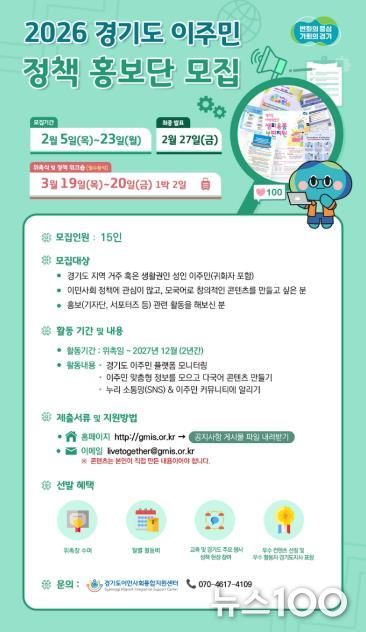 뉴스100 김동초 기자 | 경기도이민사회통합지원센터에서 오는 23일까지 ‘2026 경기도 이주민 정책 홍보단’ 15명을 모집한다.