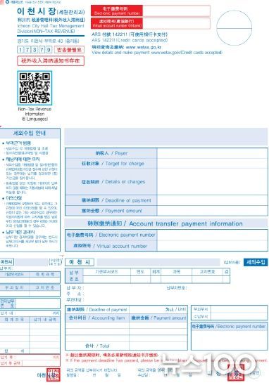 뉴스100 김동초 기자 | 이천시는 맞춤형 세무 행정 실현과 다문화 포용 정책 추진사업의 일환으로 경기도 최초 외국인 대상 다국어(영어·중국어·베트남어) 세외수입 체납고지서를 발송하고, 언어장벽으로 인한 세무 행정 사각지대 해소에 나선다고 밝혔다.