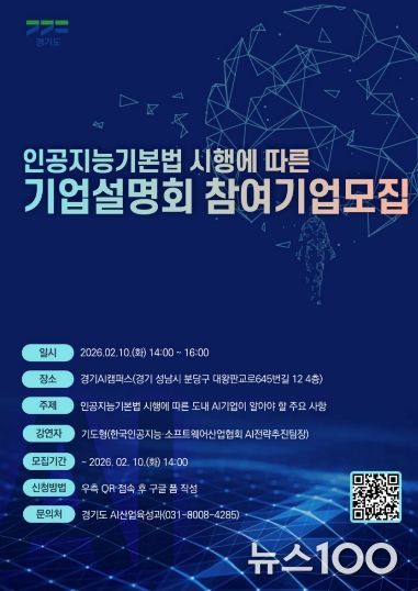 뉴스100 기자 | 경기도가 지난 1월 22일 시행된 ‘인공지능 기본법’에 대한 도내 기업들의 이해를 돕기 위해 10일 오후 2시 판교 경기AI캠퍼스에서 AI 기업 대상 설명회를 개최한다.