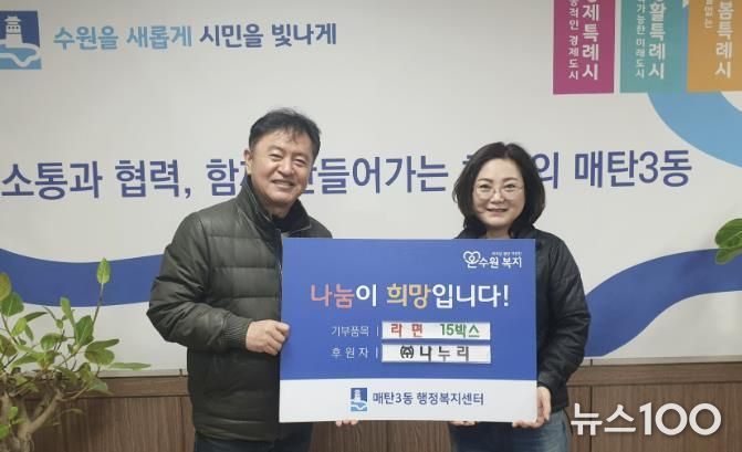 뉴스100 김동초 기자 | 수원시 영통구 매탄3동 행정복지센터는 지난 6일, 관내 폐기물 수거업체인 ㈜나누리로부터 설 명절을 맞아 어려운 이웃을 위한 라면 15박스를 기탁받았다고 밝혔다.