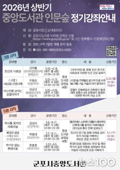 뉴스100 김동초 기자 | 군포시중앙도서관은 시민의 인문학적 소양을 함양하고 공동체적 성찰의 기회를 확대하고자 ‘중앙도서관 인문숲’ 상반기 강좌를 운영한다.