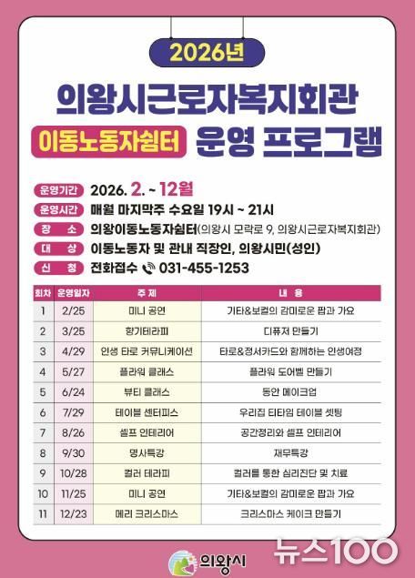 프로그램은 이동 노동자와 의왕 시민(성인)이면 누구나 참여할 수 있으며, 오후 7시부터 9시까지 20명 내외로 운영될 예정이다. 프로그램의 신청은 전화또는 현장 등록을 통해 가능하다.