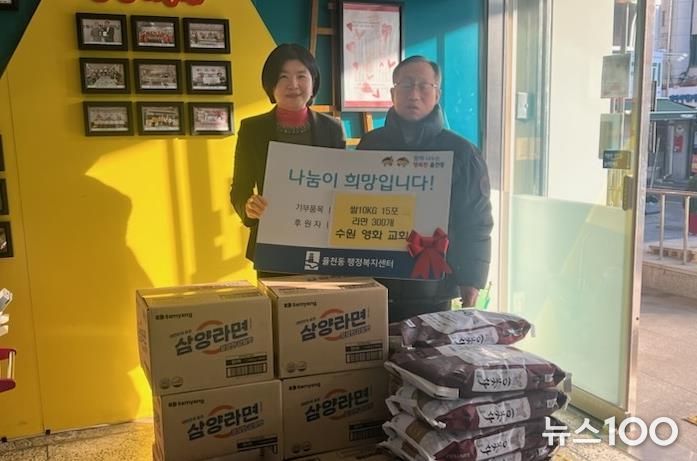 뉴스100 김동초 기자 | 수원영화교회는 지난 10일, 설 명절을 맞아 저소득 이웃을 돕기 위해 백미(10kg) 15포와 라면 300개를 장안구 율천동에 전달했다.