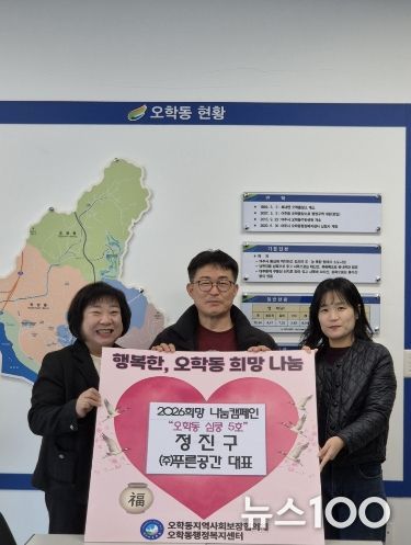 뉴스100 김동초 기자 | 여주시 오학동은 ㈜푸른공간 정진구 대표가 지난 10일 오학동 행정복지센터를 방문해 이웃돕기 성금 50만 원을 기탁했다고 밝혔다.