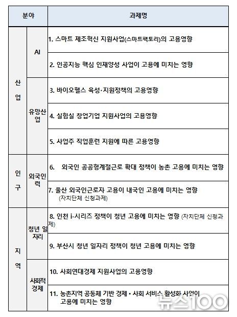 이날 회의에서는 2026년도 평가대상 후보과제에 대해서도 심의가 이뤄졌는데, 그간 고용 및 산업 전문가, 관계부처, 자치단체 등의 의견수렴 등을 거쳐 11개 후보과제가 발굴되었고, AI 등 유망산업분야(5개), 외국인 고용 등 인구구조분야(2개), 청년일자리・사회적 경제 등 지역정책분야(4개) 등 일자리에 영향을 미치는 주요 정책과제들로 확정되었다.