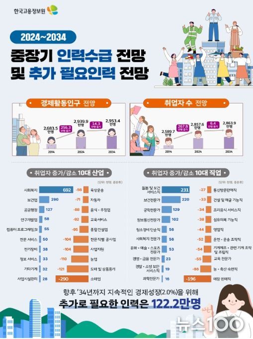 뉴스100 김동초 기자 | 한국고용정보원(원장 이창수)은 '중장기 인력수급 전망'을 통해 향후 10년간 우리나라 노동시장의 인력공급(경제활동인구)과 인력수요(취업자)가 구조적으로 전환되는 양상을 전망하고, 향후 지속적인 성장을 위해 추가로 필요한 인력을 추계했다.