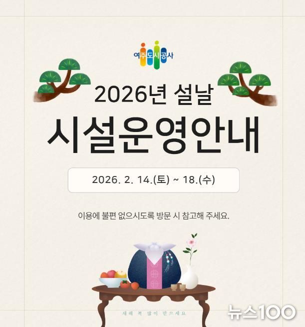 뉴스100 김동초 기자 | 여주도시공사가 다가오는 2026년 설 연휴를 맞아 시민과 귀성객들이 안전하고 편안한 명절을 보낼 수 있도록 주요 시설 운영시간 조정 및 특별 서비스를 시행한다고 밝혔다.
