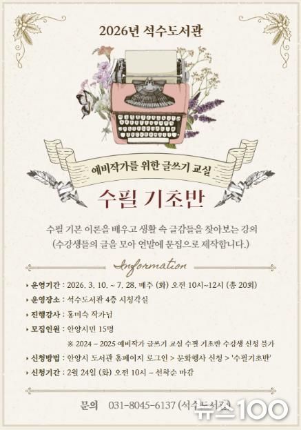 뉴스100 김동초 기자 | 안양시 석수도서관은 문학과 글쓰기에 관심 있는 안양 시민을 대상으로 ‘예비작가를 위한 글쓰기 교실’ 수필 기초반 및 소설 창작반을 운영한다고 13일 밝혔다.