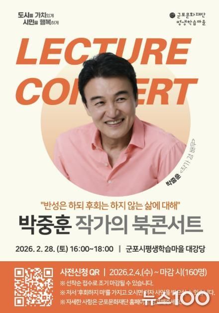 뉴스100 김동초 기자 | 군포문화재단 군포시평생학습마을은 2월 28일 렉처콘서트의 일환으로 북콘서트를 개최한다. 올해 3회를 맞이하는 렉처콘서트는 시민이 참여하여 즐길 수 있는 평생학습 대표 행사로서 자리매김하고 있다.