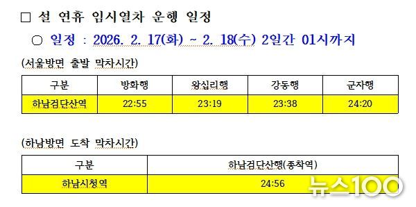 뉴스100 김동초 기자 | 하남시는 다가오는 설 연휴를 맞아 귀성객과 시민들의 안전하고 편리한 귀가를 돕기 위해 오는 2월 17일과 18일 양일간 지하철 5호선의 막차 시간을 연장 운행한다고 밝혔다.