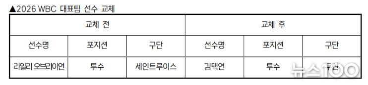 뉴스100 김동초 기자 | KBO 전력강화위원회는 부상으로 인해 WBC 참가가 어려워진 세인트루이스 라일리 오브라이언을 대체할 선수로 두산 김택연을 확정하고 WBC 조직위에 선수 교체 승인을 요청했다.