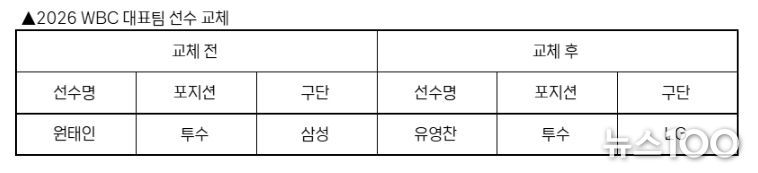 뉴스100 김동초 기자 | KBO 전력강화위원회는 부상으로 인해 WBC 참가가 어려워진 삼성 원태인을 대체할 선수로 LG 유영찬을 확정하고 WBC 조직위에 선수 교체 승인을 요청했다.