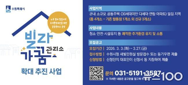 뉴스100 김동초 기자 | 수원특례시는 노후 빌라 밀집지역을 체계적으로 관리하고, 주거환경을 개선하는 ‘2026년 빌라가꿈관리소 확대 추진사업’의 대상지 신청을 3월 27일까지 받는다.