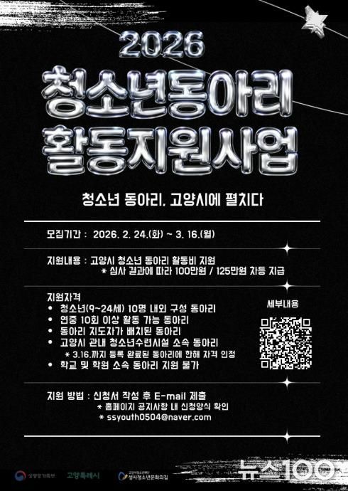 뉴스100 김동초 기자 | 고양시청소년재단 성사청소년문화의집이 ‘2026년 고양시 청소년동아리 활동지원사업’에 참여할 동아리를 오는 3월 16일까지 모집한다.