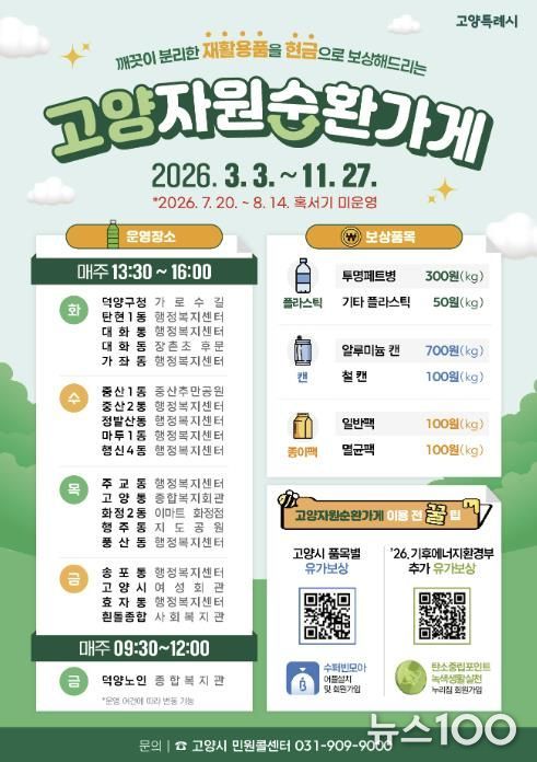 뉴스100 김동초 기자 | 고양특례시 덕양구 주교동은 오는 3월 3일부터 주민들의 자발적인 자원순환 실천을 돕고 온실가스 감축에 기여하기 위해 ‘고양 자원순환가게’를 본격 운영한다고 24일 밝혔다.