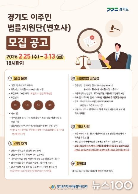 뉴스100 김동초 기자 | 경기도는 3월 13일까지 ‘경기도 이주민 법률지원단 지원사업’에 참여할 변호사를 모집한다.