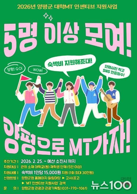 뉴스100 김동초 기자 | 양평군은 25일부터 관외 대학생들의 지역 방문을 유도하고 관광 활성화를 도모하기 위해 ‘2026년 양평군 대학 엠티(MT) 인센티브 지원 사업’을 본격 시행한다고 밝혔다.