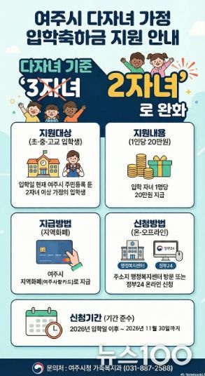 뉴스100 김동초 기자 | 여주시는 저출산 극복과 양육 부담 경감을 위해 다자녀 가정 기준을 3자녀 이상에서 2자녀 이상으로 확대하고 오는 3월부터 다자녀 가정 입학축하금 지원 신청을 받는다고 밝혔다.