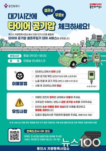 뉴스100 김동초 기자 | 용인특례시는 차량등록사업소를 방문하는 시민의 안전운전과 민원 편의 증진을 위해 ‘타이어 공기압 셀프 주입기 대여 서비스’를 운영한다고 2일 밝혔다.