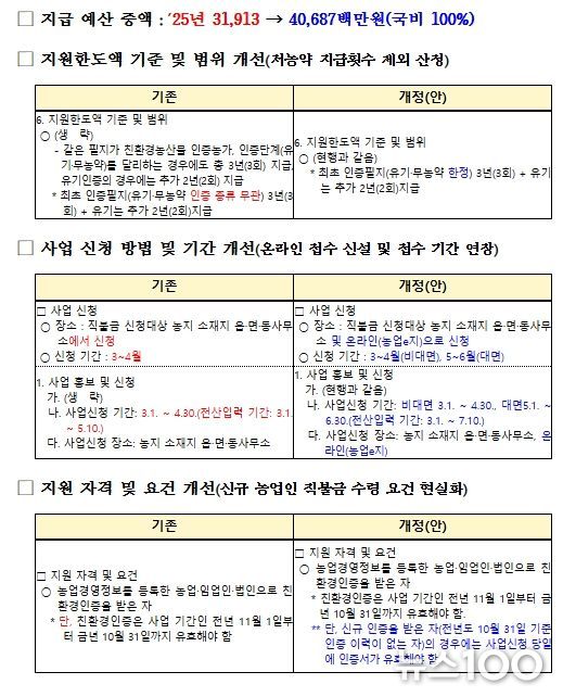 뉴스100 김동초 기자 | 농림축산식품부는 친환경농업 참여 확대와 농업인의 직불금 신청 편의 제고를 위해 친환경농업직불 시행지침이 개선했다고 밝혔다.