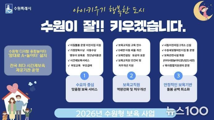 뉴스100 김동초 기자 | ‘아이 키우기 행복한 도시’를 조성하고 있는 수원특례시(시장 이재준)가 ‘2026년 보육사업 시행계획’을 수립했다.