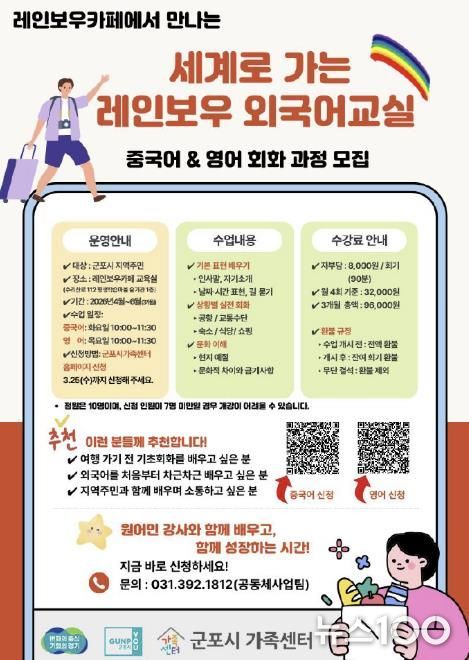 뉴스100 김동초 기자 | 군포시가족센터는 군포시민을 위한 실생활 외국어 회화 프로그램 ‘세계로 가는 레인보우 외국어교실’을 오는 4월부터 레인보우카페 교육실에서 운영한다.
