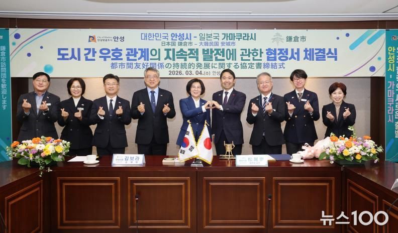 뉴스100 김동초 기자 | 안성시는 2026년 3월 4일 오전 11시 안성시청 본관 2층 상황실에서 일본 가나가와현 가마쿠라시(시장 마쓰오 다카시)와 '도시 간 우호 관계의 지속적 발전에 대한 협정'을 체결하고 양 도시 간 문화·예술 및 청소년 분야 교류를 본격 추진하기로 했다.