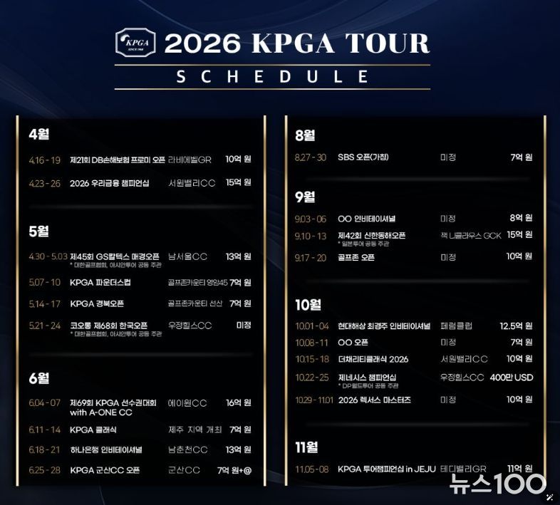 뉴스100 김동초 기자 | ㈜한국프로골프투어(대표이사 김원섭, 이하 KPGT)가 3월 5일, 2026 시즌 KPGA 투어 일정을 발표했다.