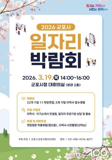뉴스100 김동초 기자 | 군포시는 오는 3월 19일 오후 2시부터 시청 대회의실에서 ‘2026년 군포시 일자리 박람회’를 개최한다. 이번 박람회는 지역 내 우수 기업과 구직자가 직접 만나는 채용의 장으로 제조, 서비스, 물류배송, 의료복지 등 다양한 분야에서 폭넓은 취업 기회를 제공할 예정이다.