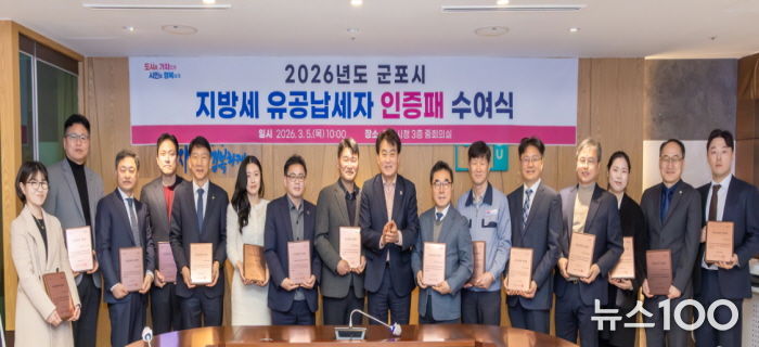 뉴스100 김동초 기자 | 군포시 하은호 시장은 3월 5일 지방세를 성실하게 납부하여 지방재정 확충에 기여한 유공납세자 15개 법인에게 ‘유공납세자 인증패’를 수여하고 감사의 마음을 전했다.