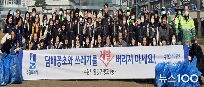 뉴스100 김동초 기자 | 영통구 광교1동 행정복지센터는 지난 3월 5일 통장협의회와 환경관리원 등 60여 명이 참여한 가운데 무단투기 지역을 중심으로 봄맞이 환경정비 활동을 실시했다.