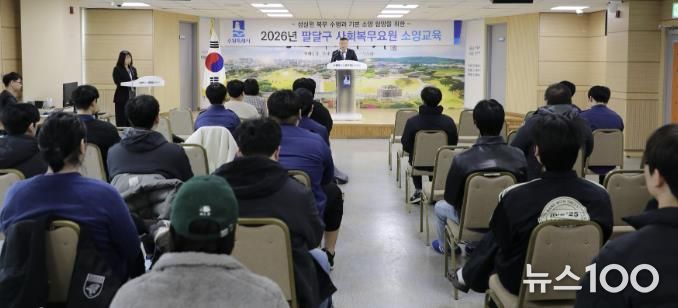 뉴스100 김동초 기자 | 수원시 팔달구는 지난 5일 팔달구청 대회의실에서 사회복무요원 전원을 대상으로 2026년 상반기 소양교육을 실시했다.