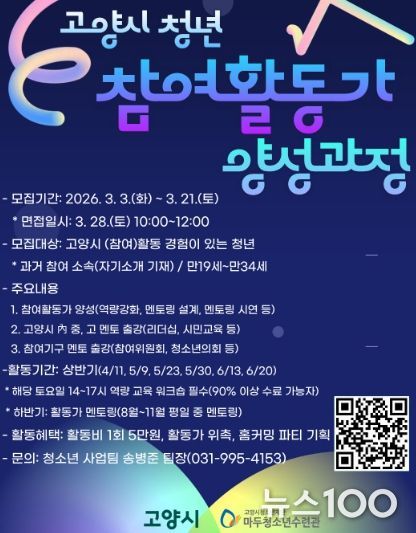 뉴스100 김동초 기자 | 고양시청소년재단 마두청소년수련관은 고양시에서 다양한 참여 활동을 경험한 청년들을 전문적인 역량을 갖춘 멘토로 육성하는 ‘2026 고양시 청년참여활동가 양성과정’ 참가자를 모집한다.