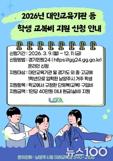 뉴스100 김동초 기자 | 남양주시는 대안교육기관 및 경기도 외 지역 중·고등학교에 입학하는 1학년 학생을 대상으로 교복비 지원사업을 추진한다고 9일 밝혔다.