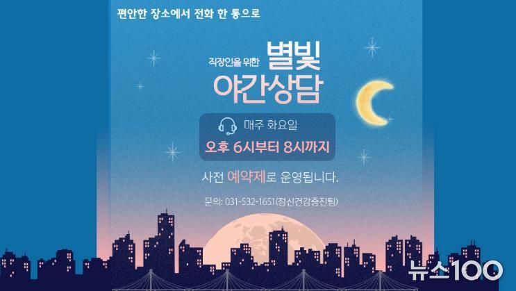 뉴스100 김동초 기자 | 포천시정신건강복지센터는 직장인, 학생, 취업 준비생 등 낮 시간 상담 이용이 어려운 시민들이 보다 편리하게 마음건강 상담을 받을 수 있도록 ‘야간 마음건강 상담서비스(별빛 야간 상담)’를 운영한다.