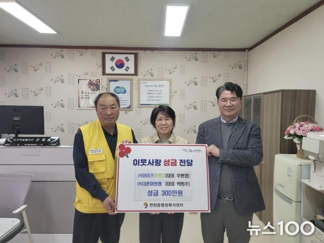 뉴스100 김동초 기자 | 연천군 소재 ㈜와이즈이앤지와 ㈜더존이엔엠은 지난 9일 연천읍 행정복지센터를 방문해 관내 어르신들을 위한 경로잔치 준비에 써달라며 성금 300만원을 기탁했다.