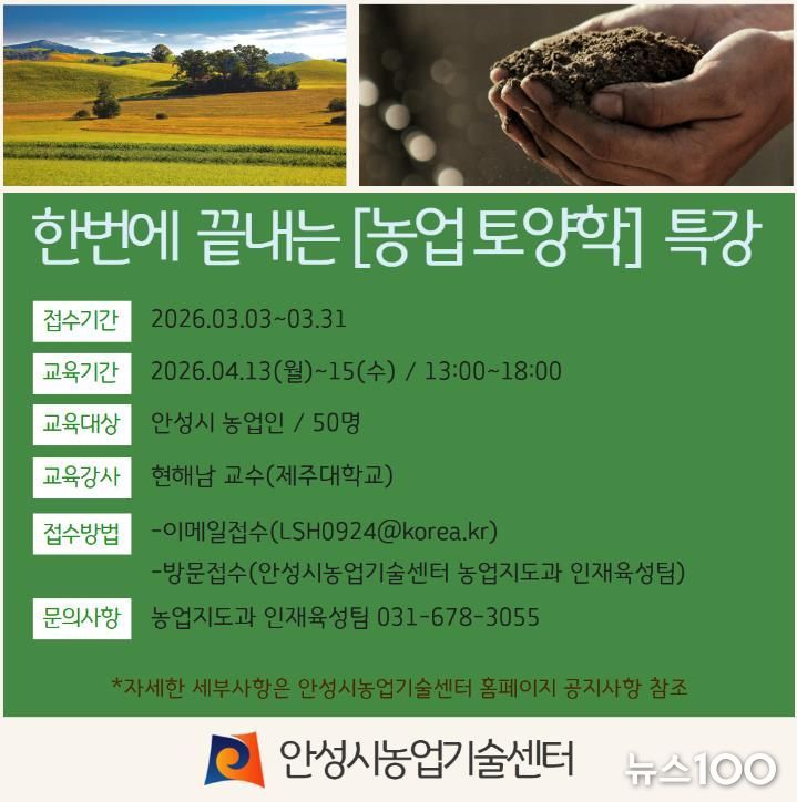 뉴스100 김동초 기자 | 안성시농업기술센터가 오는 31일까지 토양 분야 권위자인 제주대학교 현해남 교수를 초청해 ‘농업 토양학 특강’ 교육생을 모집한다.