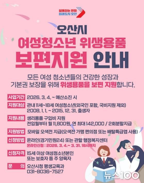 뉴스100 김동초 기자 | 오산시는 관내 11세부터 18세까지의 여성청소년을 대상으로 '여성청소년 위생용품 보편지원 사업'을 추진한다고 밝혔다.